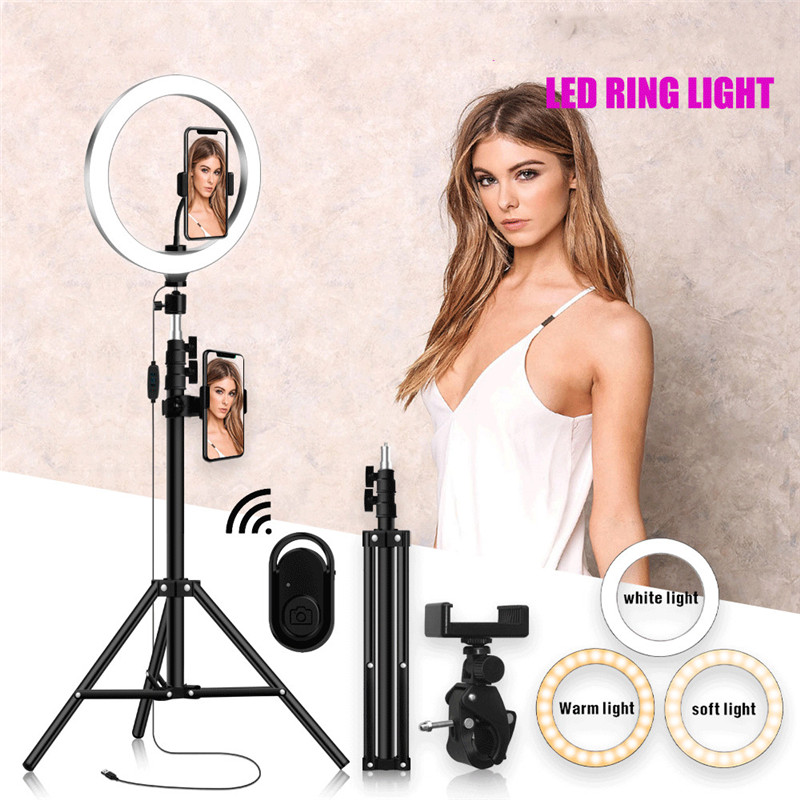 Buy products such as 10 selfie ring light led lamp mini camera ring lighting kit with rgb 3 light modes tripod stand two phone holders brightness for multi platforms livestream vlog makeup selfie youtube shooting at walmart and save.